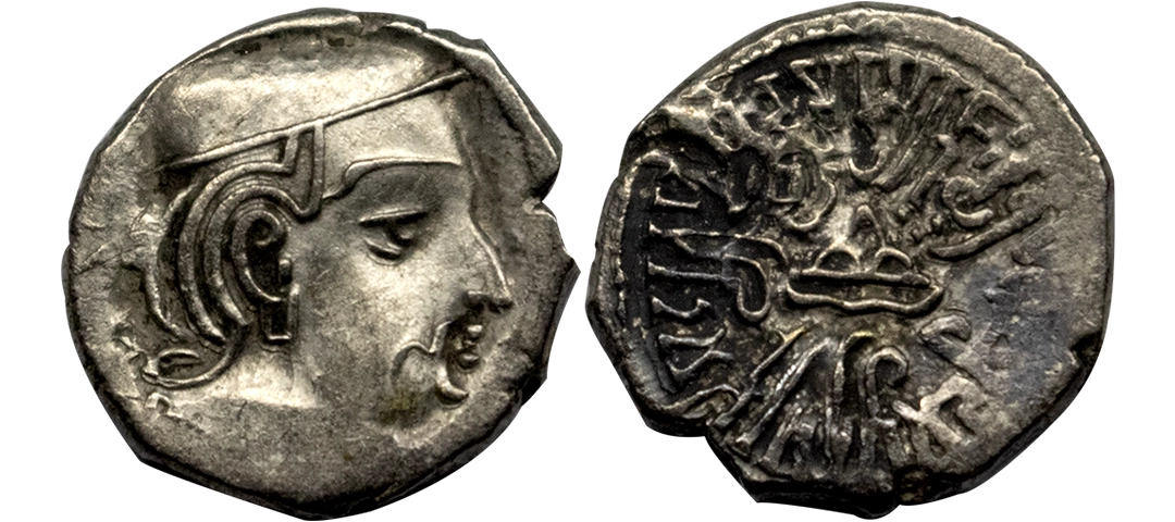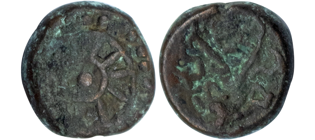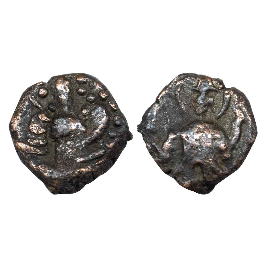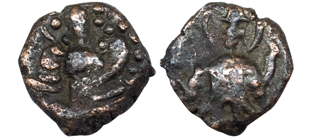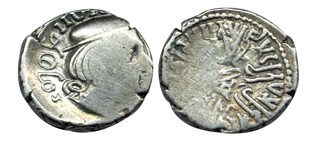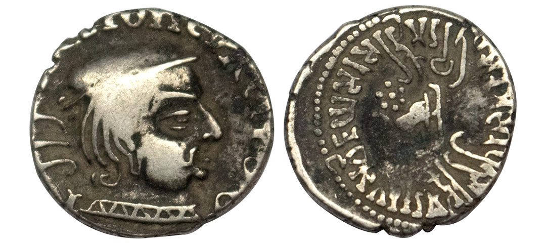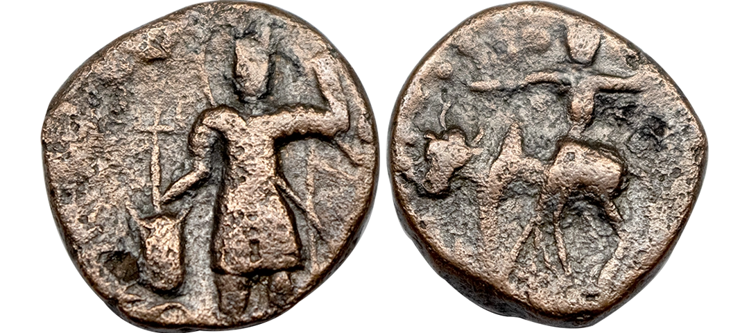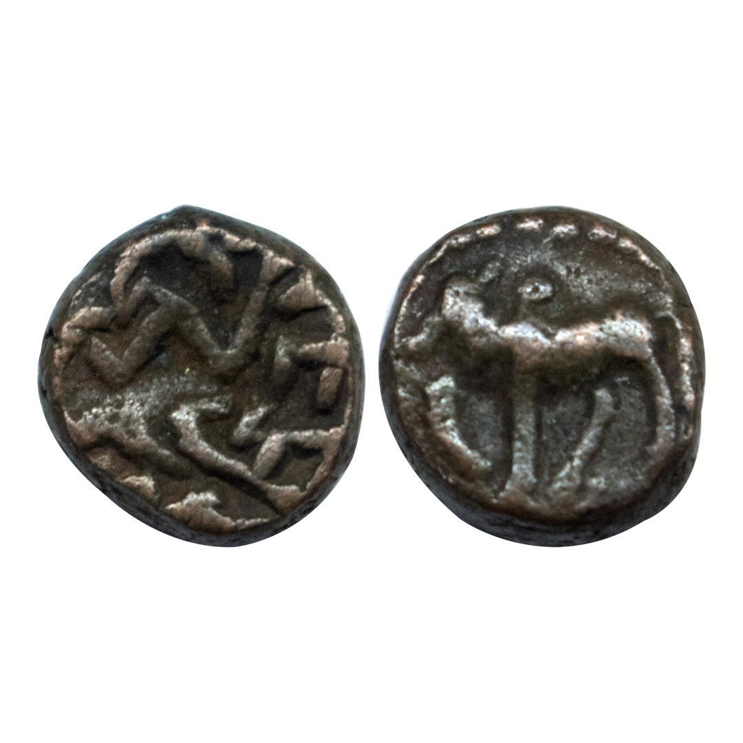 Western Kshatrapas, Rudradaman I s/o Jayadaman (c. 141-165 AD), as Mahakshatrapa, Silver Drachma, 4.15Grms, Obv: Bust of king facing to right with greek letters, Rev: Three arched hill with crescent above, sun on right and moon to left, around Brahmi legend ‘Rajno kshatrapasa Jayadamasaputrasa Rajno mahakshatrapas Rudradamasa’. (Pieper # 3366). Very Fine+.