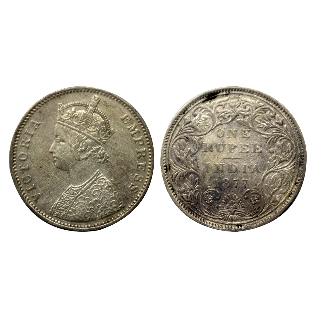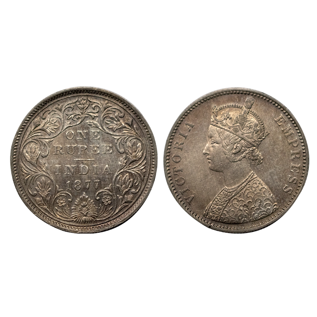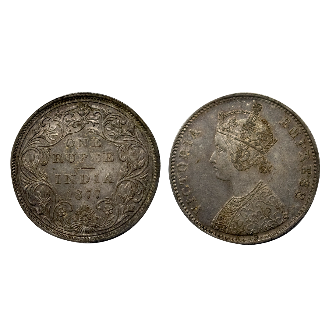 Victoria, Silver Rupee, 1877, Calcutta Mint, Obverse A2, reverse II, dot, toned, aunc,GK 435, Rare type.