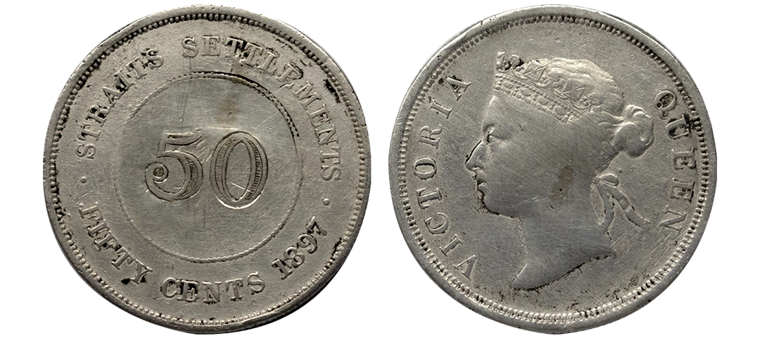Straits Settlements, Victoria Queen (1862-1901 AD), Silver 50 Cents, xx,xx gms, 1897 AD, about very fine, rare.