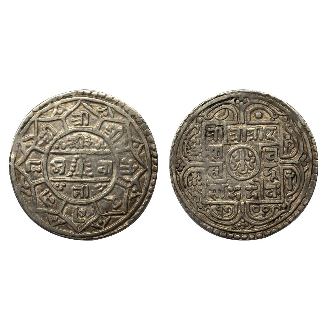 Nepal, Mahendra Bir Bikram, Commemorative issue (1955-1972 AD), Silver (.600) 10 Rupees, 15.17 gms, SE 2025, Food For All, Obv. Bust of Mahendra Bir Bikram left, Rev. Trident and 1/2 cogwheel above grain sprig, KM # 794, very fine+, very scarce.